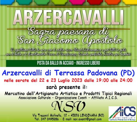 L'Associazione Culturale NSV Organizzazione Eventi APS affiliata A.I.C.S. - Comitato Provinciale di Rovigo, sarà presente in occasione della "Sagra Paesana di San Giacomo Apostolo" nelle serate di Sabato 22 e Domenica 23 Luglio 2023, a Arzercavalli di Terrassa Padovana (PD), all'interno del Campo di Calcio Parrocchiale, in Via Navegauro, 42, dalle ore 19:00 alle ore 24:00 con il Mercatino delle Tradizioni Popolari, dell'Artigianato Artistico e delle Opere d'Ingegno Creativo con curiose ed originali Idee Regalo per la Casa ed il Tempo Libero, bancarelle di Specialità Alimentari Dolci e Salate Stagionali, Prodotti e Rimedi Naturali per la Cura del Corpo e del Vivere Sano.Per tutte le sere funzionerà lo Stand Gastronomico; Musica con le migliori Orchestre del momento e Ballo su Pista in Acciaio; Pesca di Beneficenza; Giochi Gonfiabili.