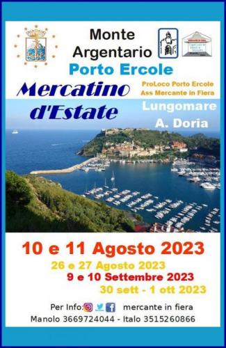 Presso il Lungomare A. Doria di Porto Ercole, a Monte Argentario in provincia di Grosseto si svolge nei giorni 10 e 11 Agosto, 26 e 27 Agosto, 09 e 10 Settembre, 30 Settembre e 01 Ottobre 2023 il Mercatino d'Estate.