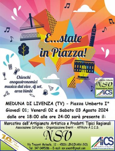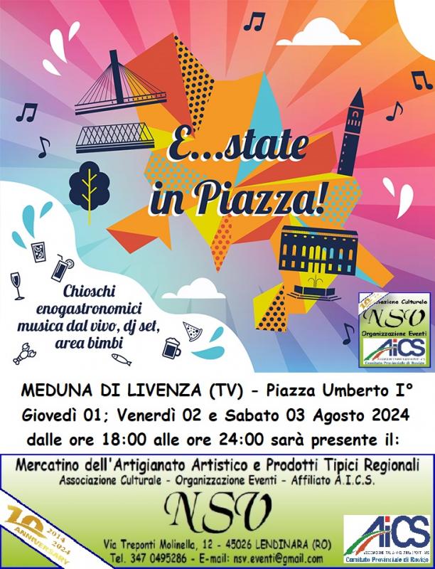 L'Associazione Culturale NSV Organizzazione Eventi APS affiliata A.I.C.S. - Comitato Provinciale di Rovigo, sarà presente in occasione della Manifestazione "E...State in Piazza!" nelle serate dal 01 al 03 Agosto 2024, a Meduna di Livenza (TV), in Piazza Umberto I° e nelle Via adiacenti, dalle ore 18:00 alle ore 24:00 con i Mercatini delle Tradizioni Popolari, dell'Artigianato Artistico e delle Opere d'Ingegno Creativo con curiose ed originali Idee Regalo per la Casa ed il Tempo Libero con dimostrazioni pratiche delle tecniche di lavorazione sul posto, Bancarelle di Prodotti Enogastronomici Tipici Regionali ed Italiani e Specialità Alimentari Dolci e Salate Stagionali prodotti artigianalmente per esaltare i Gusti e i Sapori di una tradizione antica ormai persa. Non mancheranno Stand dedicati alla Salute Naturale con Prodotti, Rimedi e Servizi che favoriscono il Benessere, la Cura del Corpo e il Vivere Sano in modo armonioso e sostenibile.Il programma della Manifestazione prevede per tutte le serate Food & Beverage di ogni tipo con la presenza di 12 Punti Ristoro gestiti dalle Attività della zona; Cocktail Zone; Live Band e DJ Set; Area bimbi con Animazioni ed Intrattenimenti.Questa Manifestazione è l'occasione giusta per festeggiare l'inizio delle ferie!!!
