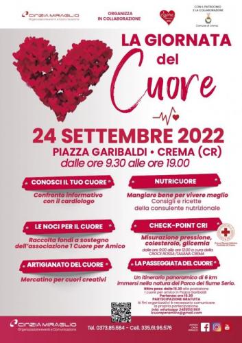 La nostra Agenzia, in collaborazione con l'Associazione @1 cuore per amico di Crema, torna il 24 Settembre 2022 a CREMA in Piazza Garibaldi per la seconda edizione "La giornata del cuore”, manifestazione che anticipa la Giornata Mondiale del Cuore (29 SETTEMBRE), promossa dalla World Heart Federation: si tratta di una campagna di informazione e sensibilizzazione sulla prevenzione delle malattie cardio-cerebro vascolari. Ogni anno la Giornata Mondiale del Cuore assume una tematica differente: il tema di quest’anno è “Use Heart For Every Heart”