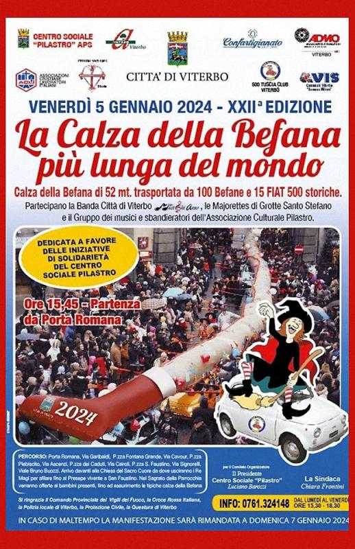 Dopo il rinvio per maltempo dello scorso 5 gennaio, la Calza della Befana più lunga del mondo è in programma questo pomeriggio con le stesse modalità e con gli stessi orari.