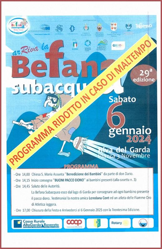 A Riva del Garda in provincia di Trento si svolge nella giornata di Sabato 06 Gennaio 2024 la 29a edizione della Festa della Befana Subacquea.