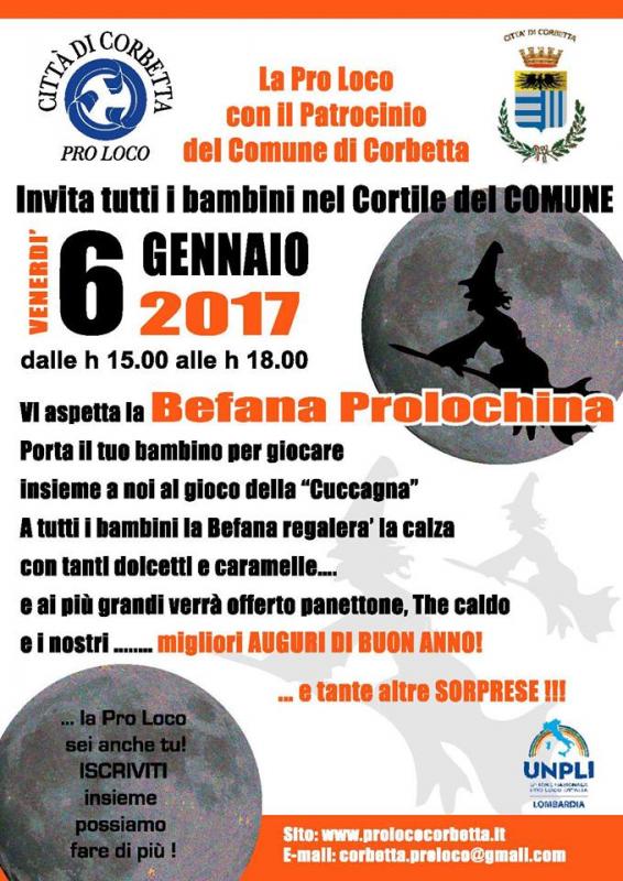 Un altro anno è passato e che dire se non un bel GRAZIE DI CUORE per averci sostenuto e partecipato con entusiasmo a tutti i nostri eventi. Anche quest'anno ci impegneremo al meglio per rendere alcune delle vostre giornate divertenti ma allo stesso tempo senza mai dimenticare quello che più ci sta a cuore, cioè l'aspetto sociale perchè quello che la Proloco vuole trasmettere è che ci si può divertire anche pensando e aiutando gli altri. Pensiamo che il sorriso che si regala agli altri è il più bel compenso che si possa ricevere quindi per cominciare l'anno nuovo con un sorriso con l'occasione ne approffittiamo per invitarvi al nostro primo evento dell'anno 2017 in compagnia della fantastica BEFANA PROLOCHINA che come ogni anno aspetta di salutare tutti i bambini ..... vi aspettiamo nel cortile del Comune Venerdì 6 Gennaio dalle ore 15:00 alle ore 18:00