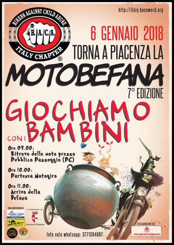 Sabato 6 gennaio 2018 arriva la settima edizione della Motobefana a Piacenza, evento organizzato dai motociclisti dell’Associazione B.A.C.A. - Bikers Against Child Abuse – (Motociclisti contro l’abuso sui Bambini).