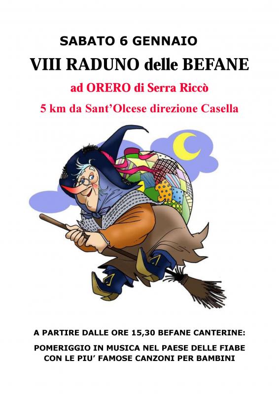 SABATO 6 gennaio pomeriggio all’insegna dell’allegria con il VIII Raduno delle Befane ad Orero di Serra Riccò. Le allegre vecchine fanno visita all’antico borgo posto sul valico appenninico più basso d’Italia a partire dalle ore 15.00 ed aspetteranno tutti i bambini con scherzetti e dolcetti. Il pomeriggio sarà animato a partire dalle ore 15,30 dalle Befane Canterine in concerto, un particolare gruppo di giovani befane che si esibiranno sui terrazzi e proporranno le più celebri canzoni per bambini. L’animazione per i più piccoli si inserisce nell’ambito della manifestazione Il presepe nel paese delle fiabe promossa dall’Associazione Sacrabandu e giunta alla XIII edizione. I bambini avranno modo di incontrare, insieme con le vecchine alle prese con le scope i personaggi a grandezza naturale di oltre 30 favole disposti lungo un facile percorso all’interno del paese. Ogni casa del paese si trasforma per ospitare Spiderman, La bella e la bestia, Cenerentola, Cappuccetto Rosso, Il libro della giungla, Harry Potter, la famiglia Addams e molti altri personaggi della fantasia con le assolute novità di quest’anno: Minions e Peppa Pig. Novità dell’edizione 2018 è la Fattoria di Babbo Natale che consentirà a tutti i bambini di incontrare gli animali vivi.