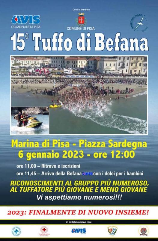 Venerdì 6 gennaio 2023 torna il tradizionale appuntamento con il “Tuffo di Befana” a Marina di Pisa. Il ritrovo per tutti i partecipanti è in piazza Sardegna alle ore 11.00 per le iscrizioni cui seguirà, alle ore 11.45 l’arrivo della Befana Avis con i dolci per i bambini e alle ore 12 il primo bagno dell’anno. L’iniziativa, giunta alla quindicesima edizione, è promossa da Avis Pisa e Amici del Mare di Livorno, patrocinata e sostenuta con il contributo del Comune di Pisa. La partecipazione al tuffo è gratuita e aperta a tutti. L’iniziativa, giunta alla quindicesima edizione, è promossa da Avis Pisa e Amici del Mare di Livorno, patrocinata e sostenuta con il contributo del Comune di Pisa. La partecipazione al tuffo è gratuita e aperta a tutti.