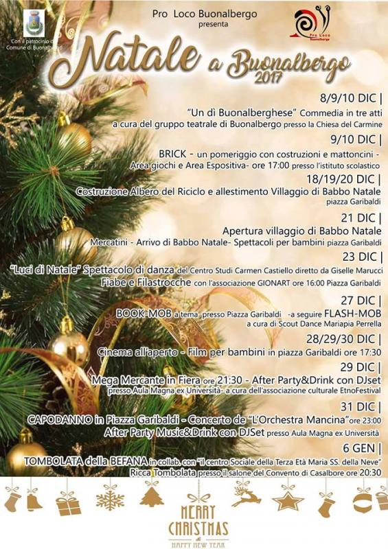 Dal 21 dicembre 2017 al 6 gennaio 2018 a Buonalbergo(Bn) sarà allestito dai volontari della Pro Loco nella piazza principale del paese, Piazza Garibaldi, il Villaggio di Babbo Natale un paradiso per i più piccoli, ma anche per i grandi, con giochi, luci, alberi di Natale con decorazioni fatte a mano, spettacoli musicali di artisti di strada, BookMob Flash mob e proiezioni di film di Natale per grandi e piccoli.