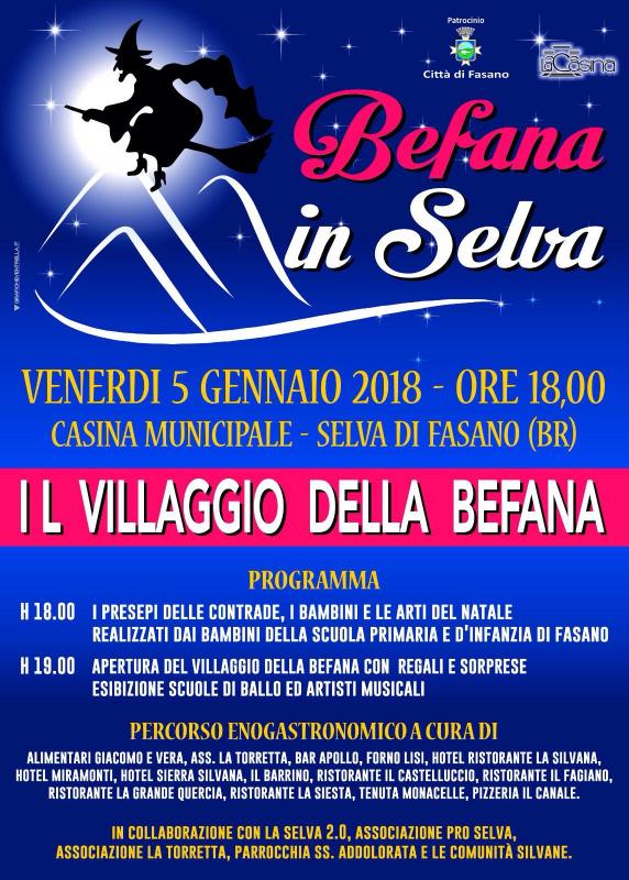 Le associazioni silvane, insieme alle attività commerciali, imprenditoriali e turistico-alberghiere della Selva hanno organizzato, a conclusione del periodo festivo, la manifestazione "Befana in Selva" che si svolgerà venerdì 5 gennaio 2018 a partire dalle ore 18,00
