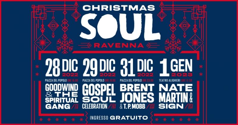 Mercoledì 28 dicembre alle 18 si esibisce in Piazza del Popolo (dove i concerti sono sempre gratuiti) la formazione italiana Goodwind & The Spiritual Gang, che propone un’esplorazione musicale tra i canti spiritual, il gospel tradizionale e le Christmas song più conosciute, seguita giovedì 29, sempre alle 18, dai francesi Gospel Soul Celebration, un quintetto guidato da Joel Rhinö che spazia fra tradizione e modernità grazie a uno stile vocale multiforme. Il saluto al 2022 nella notte del 31 dicembre (a partire dalle 23) è invece affidato a Brent Jones & T.P. Mobb, gruppo che arriva per la prima volta in tour in Italia dopo aver scalato le classifiche grazie ai successi composti dal maestro Brent Jones, produttore, musicista e maestro di coro che vanta numerose nomination ai Grammy e agli Stellar Awards. Il primo giorno del 2023 al Teatro Alighieri (alle 11.30) si viaggia invece nella tradizione gospel più autentica, affidandosi a Nate Martin & S.I.G.N. (che significa Singing In God’s Name), fondati nel 2016 nella culla della musica gospel, la città di Chicago, e per la prima volta in tour in Europa. Agli eventi di Piazza del Popolo e del Teatro Alighieri si affiancano poi gli appuntamenti di avvicinamento di “Road to Christmas Soul”, tutti ospitati dal Mercato Coperto.