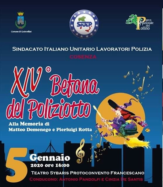 Organizzata dal Sindacato Italiano Unitario Lavoratori di Polizia, il SIULP, con il patrocinio del Comune di Castrovillari, arriverà puntuale, il 5 pomeriggio, al Teatro Sybaris del Protoconvento francescano, la “Befana del Poliziotto” carica di doni.