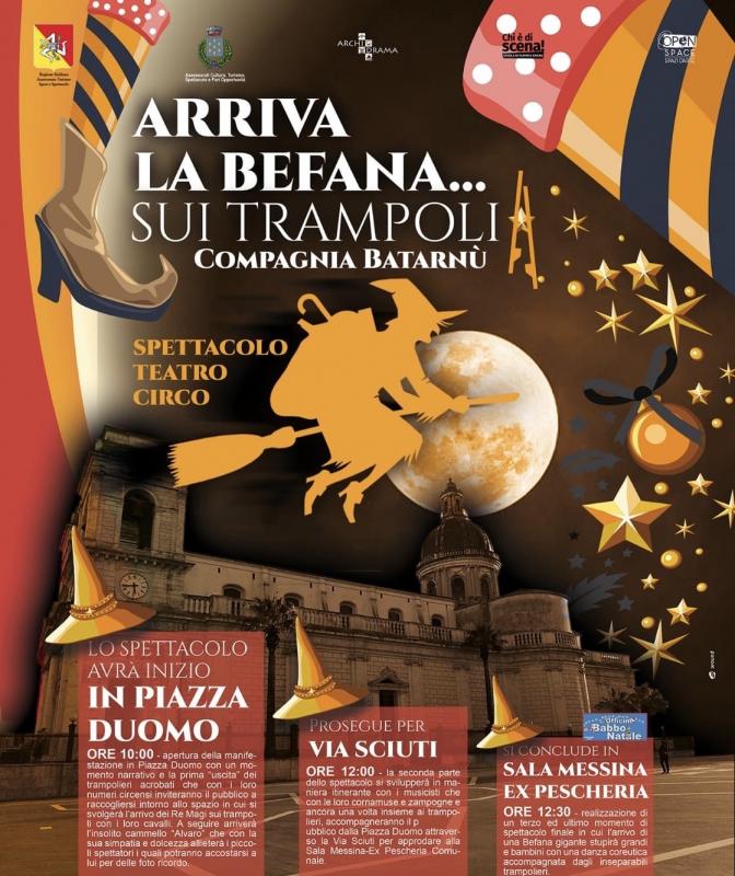 Acrobati, musici, attori, giullari e trampolieri invaderanno il 6 gennaio, a partire dalle ore 10, la Piazza Duomo di Giarre, dando vita allo spettacolo di teatro circo itinerante Arriva la Befana…sui trampoli, rivolto principalmente ai bambini e alle famiglie. Protagonisti saranno gli artisti professionisti della compagnia Batarnù, che sin dai primi anni della sua attività avvia la sperimentazione nel teatro di strada, iniziando ad utilizzare trampoli, giocoleria ed effetti di fuoco e producendo numerosi spettacoli tra pièce teatrali e performance di circo di strada. Parallelamente è portata avanti la ricerca sul teatro di strada spettacolare, affiancando all'azione teatrale e alla musica dal vivo, le arti circensi, le danze sui trampoli, l'uso di maquine sceniche e strutture mobili, e infine le coreografie di giochi di fuoco, per la produzione di spettacoli d'impatto nei quali i miti e le leggende rivivono tra epica e testi classici, teatro dei luoghi e performance di strada, tra cunto popolare e ricerca storica. La compagnia è composta da artisti poliedrici che, dalla musica, dal teatro, dalla giocoleria e dall'acrobatica, traggono le risorse per un lavoro collettivo che mette in relazione i diversi apporti in un unico progetto artistico e teatrale.