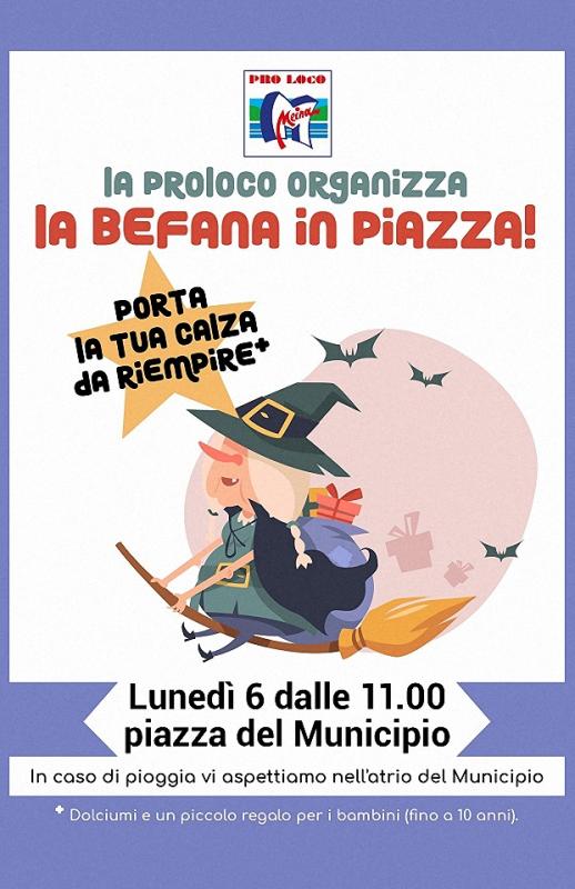 Lunedì 06 Gennaio 2025 dalle ore 11.00 in Piazza Municipio a Meina la Pro Loco organizza "La Befana in Piazza!". Distribuzione dolciumi a tutti i bambini.