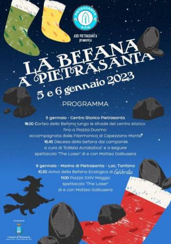 Inoltre la Befana “Ecologica” alla vigilia dell’epifania dopo essere arrivata dal mare andrà ad asciugarsi le pinne volando fino in centro storico aiutata dagli amici di A.S.D. Pietrasanta, accompagnata dalla Filarmonica di Capezzano Monte e salterà giù dal campanile sorvegliata da E.Acrobatica.