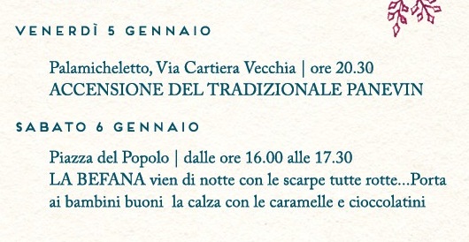 Il 5 gennaio, alle ore 20,30 presso il Palamicheletto, ci sarà l'accensione del tradizionale "Panevin" a cura della Pro Sacile, mentre il 6 gennaio in Piazza del Popolo si svolge la Festa della Befana con la consegna della calza piena di dolciumi ai bambini buoni.