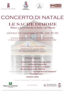 Il tradizionale concerto di Natale, dal titolo “Le Sacre Dimore. Milano e la Lombardia in Italia e nel Mondo” si terrà Giovedì 22 Dicembre 2016 alle ore 21 nella Chiesa di San Gaudenzio, promosso dall’Associazione Pietro Mongini, dal Comune di Fagnano Olona, dalla Comunità Pastorale Madonna della Selva e dalla Pro Loco Fagnano Olona, e patrocinato dalla Presidenza del Consiglio della Regione Lombardia.