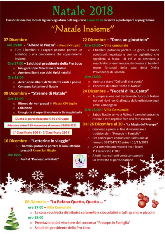 L'associazione Pro Loco Figline Vegliaturo organizza per tutto il periodo natalizio una serie di manifestazioni per rendere ancora più speciali le feste. Tra mercatini di Natale, presepi, appuntamenti per bambini e l'arrivo della Befana, Figline Vegliaturo mira a diventare la meta di famiglie alla ricerca di un posto tranquillo in cui passare belle giornate.