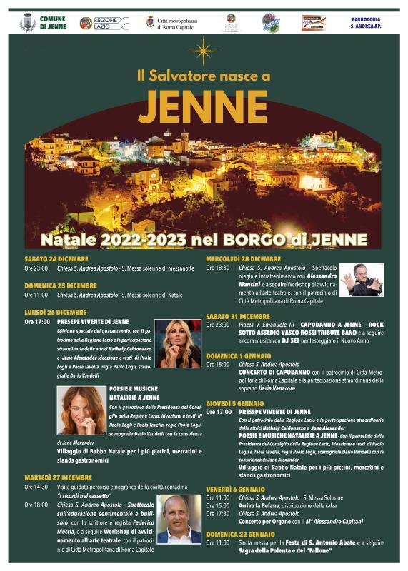Jenne – E’ stato presentato il ricco calendario degli eventi che caratterizzano le festività jennesi 2022-2023… come promesso ecco le ultimissime. Il Presepe Vivente e le Poesie e Musiche Natalizie, che con la partecipazione anche di professionisti dello spettacolo come le affascinanti e bravissime attrici Jane Alexander e Nathaly Caldonazzo, andranno di scena il 26 dicembre 2022 ed il 5 gennaio 2023, saranno affiancati da altre iniziative di primissimo piano. Il programma natalizio del piccolo borgo di Jenne, infatti, quest’anno si arricchisce di altri eventi che a partire dalla bellissima messa di mezzanotte del 24 dicembre delizieranno tutti coloro che vorranno visitarlo durante l’intero periodo natalizio, giunto oramai alle porte: dopo le rappresentazioni del 26, il 27 ed il 28 di dicembre prevedono visite guidate e spettacoli importanti, prima con lo scrittore Federico Moccia e poi con l’artista Alessandro Mancini, seguiti da workshop di avvicinamento all’arte teatrale, il 31 di dicembre invece vede in programma la musica rock dal vivo per salutare il vecchio anno, chè il nuovo si aprirà con uno spettacolare concerto di musica classica con la partecipazione straordinaria della bravissima ed incantevole soprano Ilaria Vanacore. Ma non finisce qui: mercatini di natale, villaggio di Babbo Natale per i più piccini, che il 6 gennaio potranno ricevere la loro calza direttamente dalla Befana, e poi stand gastronomici per tutti i gusti. Un palinsesto insomma da favola, nel segno del divertimento, certo, dell’aggregazione, vero, ma soprattutto della cultura