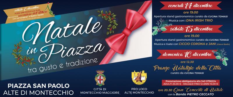 A Montecchio Maggiore il Natale arriva l'8 dicembre. Inizieranno infatti domani in piazza S. Paolo ad Alte Ceccato i festeggiamenti di "Natale in piazza tra gusto e tradizione", manifestazione organizzata dalla Pro Loco Alte-Montecchio con la collaborazione e il patrocinio della Città di Montecchio Maggiore. L'evento torna quindi ad Alte, da dove era partito, dopo il momentaneo trasloco dellanno scorso in piazza Marconi per via dei lavori che interessavano piazza S. Paolo.