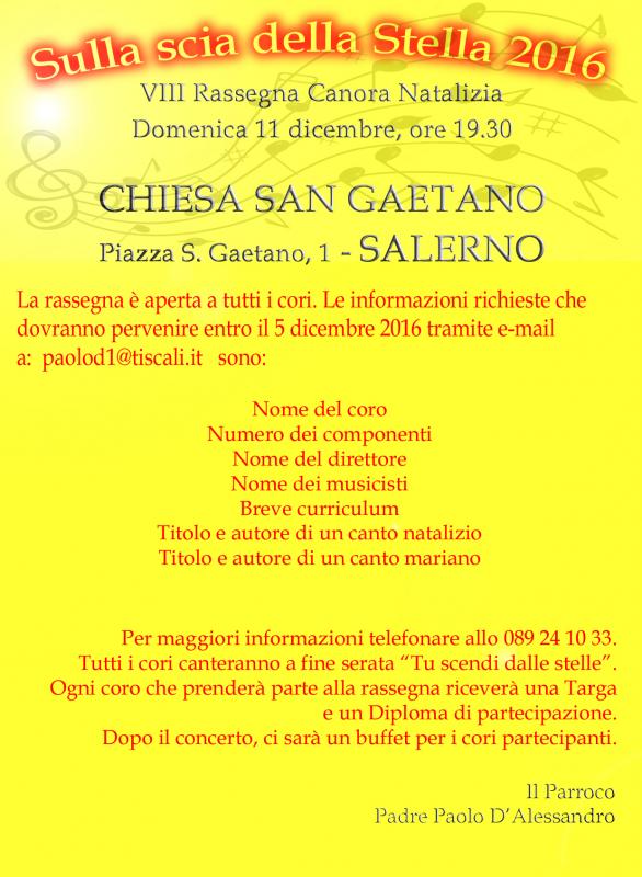 Domenica 11 dicembre alle ore 19.30 si terrà nella Chiesa di San Gaetano a Salerno l'evento "Sulla scia della Stella 2016", la rassegna natalizia dei cori giunta all'VIII edizione.