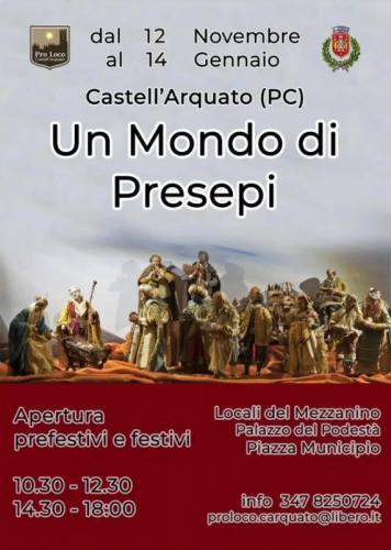 Un Mondo di Presepi 2023 a Castell'Arquato, aperto dal 12 novembre 2023 al 14 gennaio 2024, tutti i giorni festivi e prefestivi, con orario 10:30-12:30 e 14:30-18:00 si svolge nel locale del Mezzanino, in piazza Municipio (entrata posteriore Palazzo del Podestà).