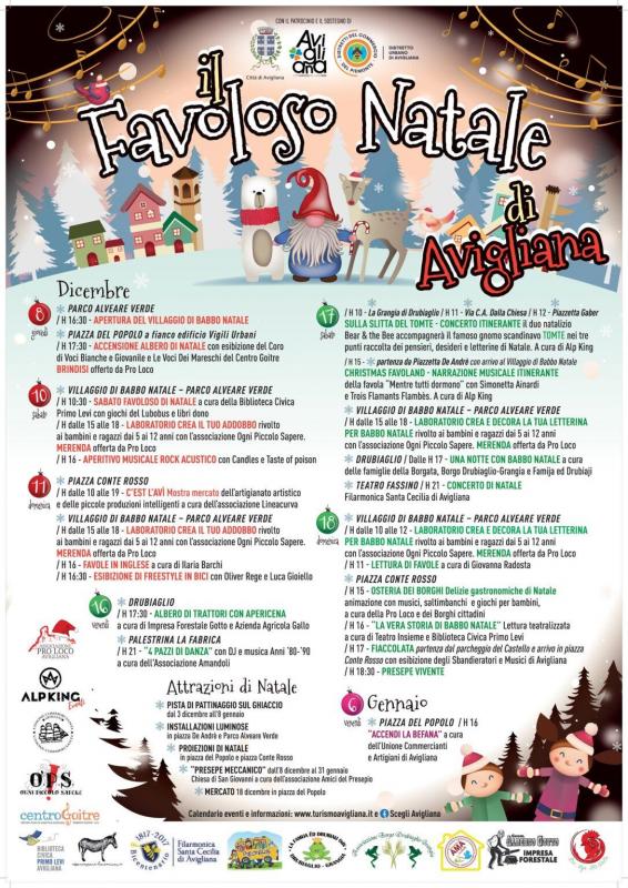 Dal 8 dicembre 2022 al 6 gennaio 2023 giorno in cui si festeggia l'Epifania e la Befana, un ricco calendario di eventi allieta il Natale ad Avigliana: mercatini natalizi, tradizioni, villaggio di Babbo Natale, animazioni per i bambini, musica, brindisi con il vin brulè e tanto altro durante il periodo più magico dell'anno.