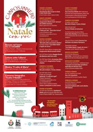 Si è a appena conclusa la rassegna “Incontri d’Autunno”- che ha chiuso i battenti con un evento speciale dedicato all’Età medievale - e già si accendono i riflettori sulle ormai prossime festività natalizie e sulla ventunesima edizione di “NATALE CON VOI” - rassegna di cultura, spettacolo, folklore che animerà la città da inizio dicembre fino all’Epifania, promossa dal Comune di Camposampiero e dalla Pro Loco, in collaborazione con Associazioni cittadine, Scuole, Teatro Ferrari, Distretto del Commercio Torri e Acque, Camera di Commercio di Padova, Venice Promex, Padova Looking Ahead & Beyond, Confesercenti del Veneto Centrale, Cescot, Ascom Confcommercio, Associazioni di Categoria, Commercianti e tutti i Partner che hanno partecipato al progetto.