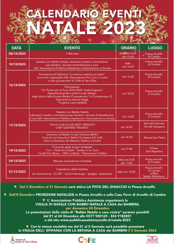 Sabato 16 dicembre alle ore 16.30 cerimonia di premiazione della III edizione de “La vetrina natalizia più bella” in Piazza Arnolfo con il concorso organizzato dalla Pro Loco e rivolto a tutti gli esercenti di Colle di Val d’Elsa mentre alle ore 18.30 premiazione “Un Poster per la Pace 2023-2024: Osate Sognare” esposizione grafico-pittorica dei disegni degli alunni delle Scuole Medie (Comprensivo 1 e Comprensivo 2) con esposizione sotto le logge e premiazione in Piazza Arnolfo per un progetto a cura del Lions Valdelsa.