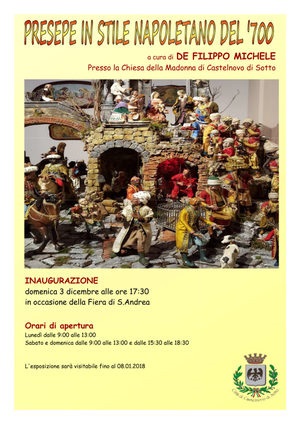 Da domenica 3 dicembre a lunedì 8 gennaio, nella Chiesa della B.V. della Misericordia, esposizione del presepe in stile napoletano del '700 di De Filippo Michele e mostra fotografica "Castelnovo...un paese, la sua anima" a cura del Gruppo Fotografico Prisma.