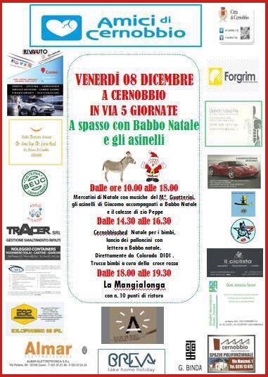 Venerdì 8 Dicembre 2017 "A SPASSSO CON BABBO NATALE" in Cernobbio (CO) Via 5 Giornate dalle 7:30 alle 19:00 - MERCATINI DI NATALE con Hobby, Artigianato, Sapori Regionali e oggettistica Varia.