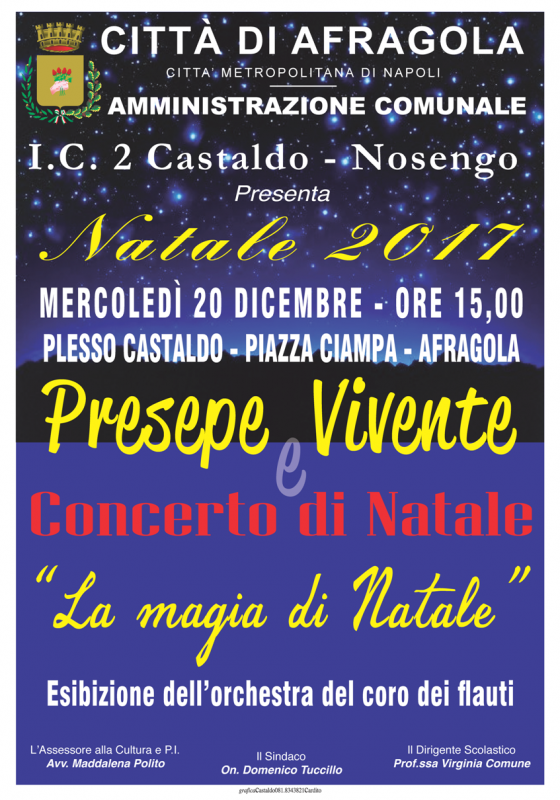Mercoledì 20 dicembre 2017 alle ore 15, nel Plesso Castaldo di piazza Ciampa ad Afragola si terranno due eventi natalizi: il Presepe Vivente e il Concerto di Natale dell’orchestra del coro dei flauti.