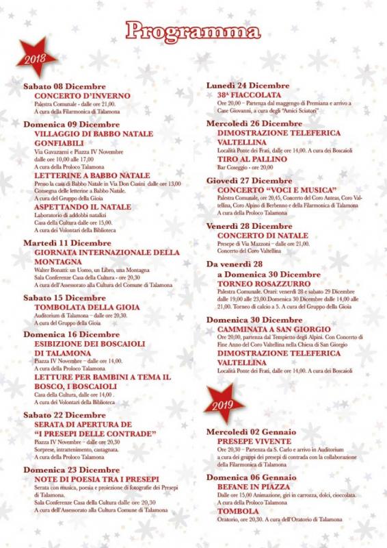 Dal 08 dicembre 2018 al 06 Gennaio 2019 a Talamona si svolgono le divertenti manifestazioni del Natale Talamonese
