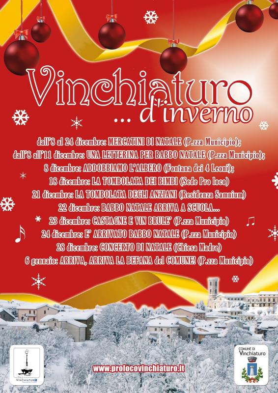 Dall'8 dicembre 2016 al 6 gennaio 2017 arriva Vinchiaturo d'Inverno con i tanti eventi dedicati al Natale: Mercatini natalizi, tombola, castagne e vin brulè, arrivo di Babbo Natale e Festa della Befana.
