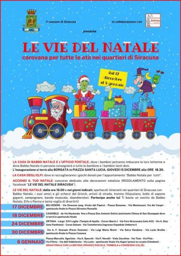 dalle ore 10.00 e nei giorni indicati, spettacoli itineranti nei quartieri di Siracusa con Babbo Natale, i suoi amici e gli scherzi del Grinch, artisti di strada, trenino lillipuziano, bolle di sapone giganti, zampognaro, banda musicale, sbandieratori.