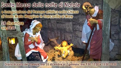Ecco gli orari delle principali celebrazioni festive della Parrocchia Madre di Francavilla al Mare nei giorni di Natale: domenica 24 dicembre, vigilia di Natale, alle ore 18.00 sarà celebrata la santa Messa vigiliare nella chiesa di sant’Antonio di Padova; alle ore 23.30 si terrà la veglia di Natale nella chiesa di san Franco dove alle ore 24.00 avrà inizio la santa Messa della notte. Lunedì 25 dicembre, Natale del Signore, le sante Messe saranno celebrate alle ore 8.00 nella chiesa della Madonna delle Grazie e alle ore 10.30 e 18.00 nella chiesa di san Franco. Domenica 31 dicembre, vigilia dell’ottava di Natale, alle ore 17.00 ci saranno le confessioni nella chiesa di sant’Antonio e alle ore 18.00 la santa Messa solenne col canto del Te Deum di fine anno: per l’occasione si potrà lucrare l’indulgenza plenaria della Mamma nostra nella chiesa di sant’Antonio, così come nel giorno seguente. Sabato 6 gennaio, Epifania del Signore, alla santa Messa delle ore 18.00 nella chiesa di san Franco, seguirà il tradizionale bacio dell’immagine di Gesù bambino, prima di essere riposto.