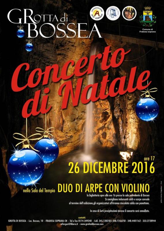 Appuntamento per il 26 dicembre, alle ore 17.00 alle Grotte di Bossea per il tradizionale “Concerto di Natale“. Si esibiranno in concerto nella Sala del Tempio un duo di arpe con violino.