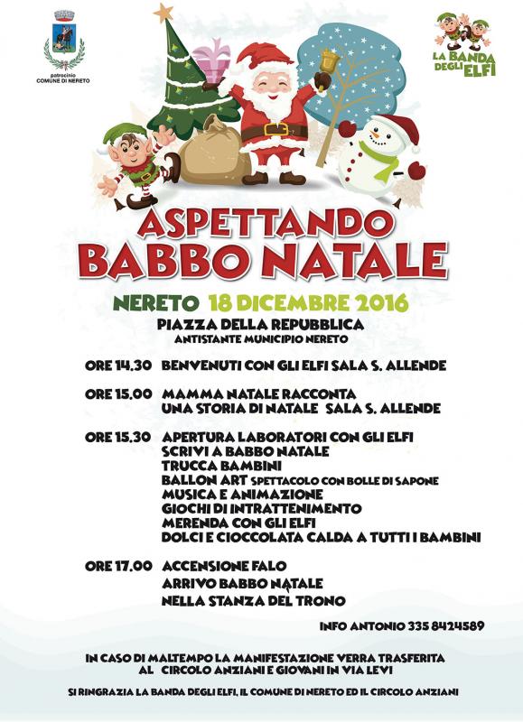 Nel pomeriggio di domenica 18 Dicembre, a cura della Banda degli Elfi, ci sarà l'evento "ASPETTANDO BABBO NATALE" che si svolgerà nella piazza adiacente il comune e che culminerà con l'arrivo di Babbo Natale nei locali comunali.