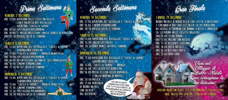 PROGRAMMA. Venerdì 7 dicembre, dalle ore 17:00, apertura delle Feste Natalizie con l'ingresso nel "Villaggio" e l’area “Calici&Sapori”. Alle ore 18 spettacolo per bambini. Alle ore 19 santa messa prefestiva con la "Corale di Ripattoni". Alle ore 20.30 musica. Sabato 8 dicembre, alle ore 11, l’apertura del Villaggio, “Calici&Sapori” e laboratorio creativo. Alle 13 pranzo con menù fisso. Alle 16 spettacolo per bambini; alle 18 messa della solennità dell'Immacolata Concezione. Alle 18.30 cinema d’animazione. Alle 21.30 DJ Set sotto il tendone. Domenica 9 dicembre, ore 11, Apertura del Villaggio , area “Calici&Sapori” e laboratorio creativo. Ore 13 pranzo, alle 15.30 cinema d'animazione, alle 17.30 spettacolo per bimbi. Alle 20.30 musica sotto il tendone.
