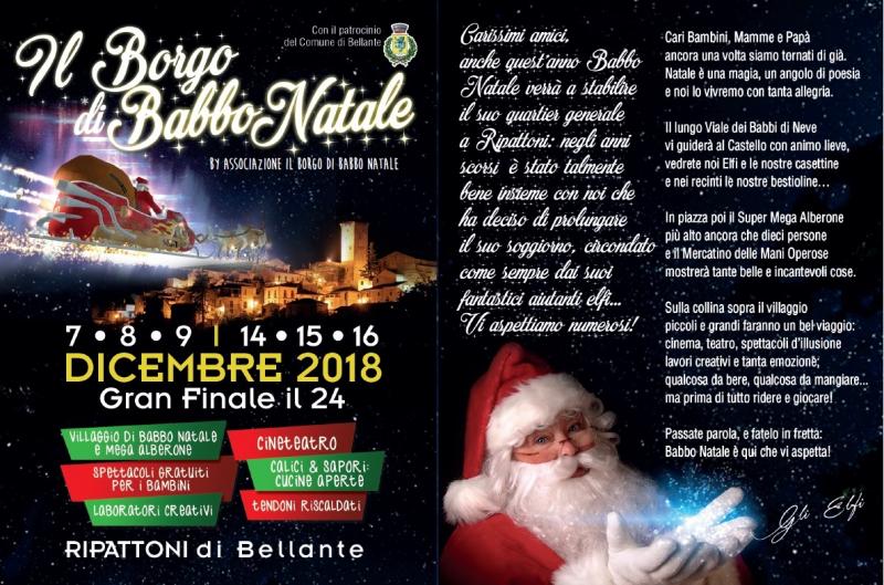 BELLANTE – E’ tutto pronto a Ripattoni per la terza edizione del “Borgo di Babbo Natale” che per due weekend consecutivi, dal 7 al 9 e dal 14 al 16 dicembre, ospiterà il villaggio tematico, i mercatini, cinema, teatro, laboratori creativi e tanti spettacoli per far assaporare la vera magia del Natale a grandi e piccini.