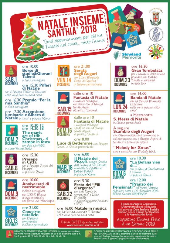 Le iniziative in occasione delle festività natalizie promosse dall’Amministrazione comunale in collaborazione con la Parrocchia di Santhià, la Compagnia dell’Armanàc e diverse associazioni locali sono rivolte a tutte le fasce d’età, dai più piccoli ai più grandi, e sono all’insegna della solidarietà.