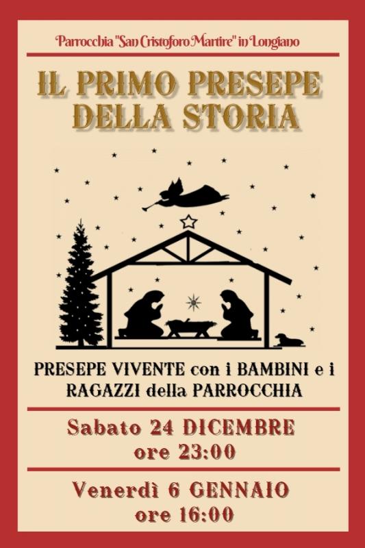 Nel percorso della “Longiano dei presepi” c’è anche un presepe vivente. “Il primo presepe della storia” - questo il titolo della sacra rappresentazione - avrà luogo all’interno della chiesa collegiata di San Cristoforo martire sabato 24 dicembre alle ore 23.