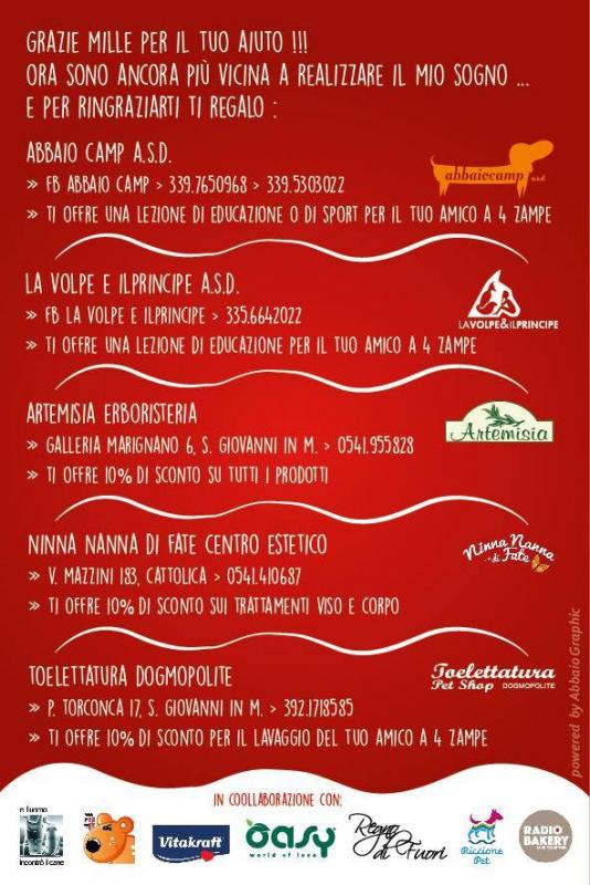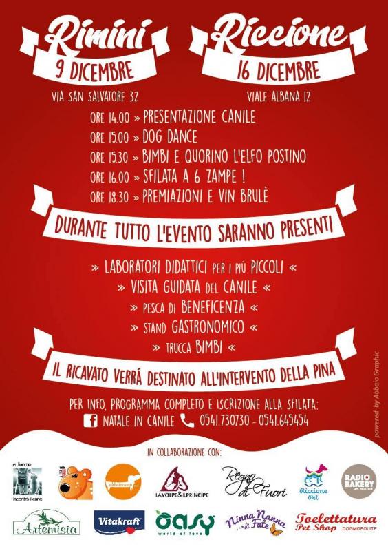 > Ringraziamenti: i canili comunali di Rimini e Riccione ringraziano gli sponsor Oasi, fornitore di mangimi per entrambe le strutture, Vitakraft e Riccione Pet. Inoltre, l’evento “Natale in Canile” vede la collaborazione con Abbaio Camp A.S.D. e La Volpe e il Principe A.S.D. che offrono una lezione di educazione o di sport per gli amici a 4 zampe; Artemisia Erboristeria che offre 10% di sconto su tutti i prodotti; Ninna Nanna di Fate Centro Estetico che offre il 10% di sconto sui trattamenti viso e corpo; Toelettatura Dogmopolite che offre il 10% di sconto per il lavaggio degli amici a 4 zampe.