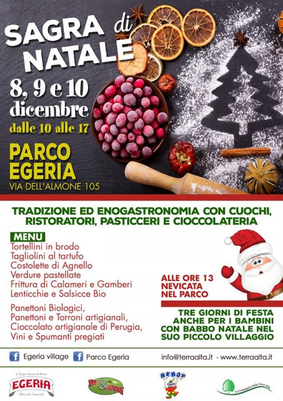 Alla Sagra di Natale non si mangia solo! In un clima magico ed accogliente, Babbo Natale vi accoglierà in compagnia di simpatici Elfi, nel suo piccolo villaggio o sulla sua slitta, per assistere ai divertenti spettacoli di Artisti di Strada o per partecipare ai laboratori di decorazione natalizia, di biscotti, oppure giocare a tombola ma soprattutto per assistere, ogni giorno alle ore 13, alla spettacolare nevicata nel parco.