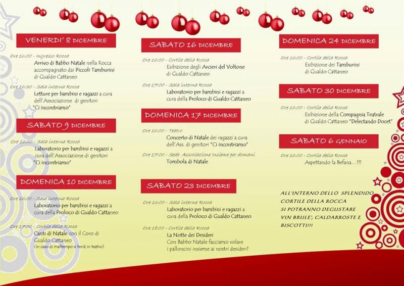 Tanti gli eventi in programma nel cortile della Rocca, letture animate, attività e giochi, canti e cibi della tradizione. All'interno della Rocca Babbo Natale sarà lieto di incontrare i più piccini nella sua dimora.