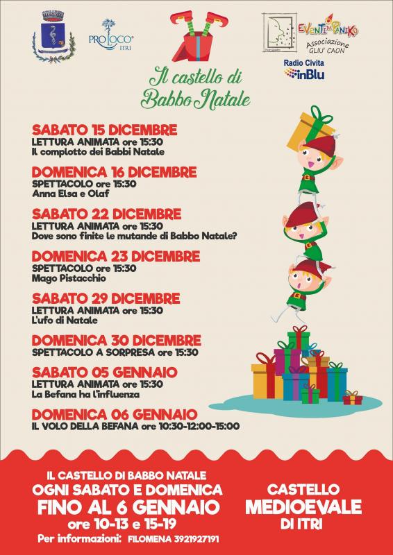 Continuano gli eventi del “Castello di Babbo Natale” presso il castello medioevale di Itri (LT), in Via Sant’Angelo 60, il fantastico e magico mondo di elfi, folletti, artisti di strada, gli amici Minnie e Topolino, letture animati e tante fantastiche sorprese per grandi e bambini.