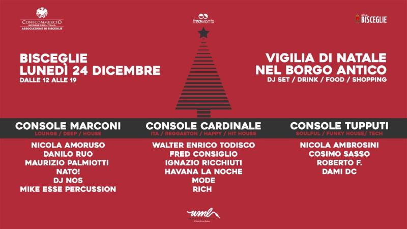 Il Natale è da sempre legato a riti gastronomici: uno fra tutti è quello della Vigilia che è entrato a far parte della cultura popolare. A Bisceglie La Vigilia di Natale è nel borgo antico, la consuetudine di attardarsi e indugiare per le vie dello splendido centro storico, con la possibilità di degustare le prelibatezze nelle attività del centro storico, acquistando gli ultimi regalini da mettere sotto l’albero, quest’anno sarà accompagnata dalle sonorità accattivanti dell’ottima musica targata FreEvents, che spazia dal jazz, al soul, alla leggera italiana sino a sonorità più da club. Dalle ore 12 alle 19,00 di lunedì 24 dicembre si potrà andare alla scoperta di profumi, sapori e cibi legati al territorio per poi rientrare a casa in vista del cenone, come da tradizione. L’appuntamento per quest’anno coinvolgerà ben tre postazioni delle consolle che prendono il nome delle vie del magnifico borgo: “Via Marconi”, “Via Cardinale Dell’Olio” e “Via Tupputi”, attirando l’attenzione del pubblico con il meglio del djing del territorio, opportunamente selezionato dal direttore artistico Nicola Amoruso, impegnato anch’egli in un set coinvolgente in via Marconi assieme a Danilo Ruo, Maurizio Palmiotti, Nato!, Dj Nos e Mike Esse alle percussioni. In via Cardinale dell’Olio protagonisti saranno: Walter Enrico Todisco, Fred Consiglio, Ignazio Ricchiuti, Havana La Noche, Mode e Rich. Contestualmente in via Tupputi si esibiranno i djs Nicola Ambrosini, Cosimo Sasso, Roberto F. e Dami DC.