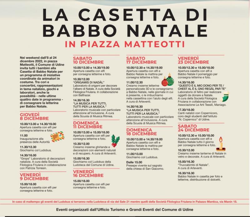 Nei fine settimana dall'8 al 24 dicembre in piazza Matteotti si svolgeranno diverse attività per famiglie e bambini a tema natalizio, con la Casetta di Babbo Natale che sarà al centro del programma. La casetta vedrà la presenza di animatori in vestito da elfo che accoglieranno i bambini e chi vorrà potrà lasciare la sua letterina per Babbo Natale.