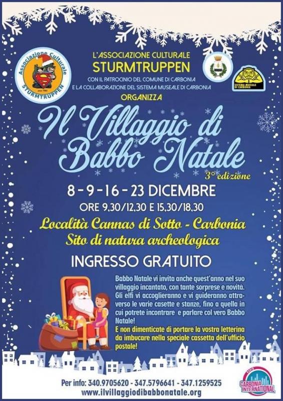 Il Villaggio di Babbo Natale, realizzato dall'Associazione Culturale Sturmtruppen con il patrocinio del Comune di Carbonia, sarà aperto nei giorni 08, 09, 16 e 23 dicembre 2018 dalle ore 9,30 alle 12,30 e dalle ore 15,30 alle 18,30.