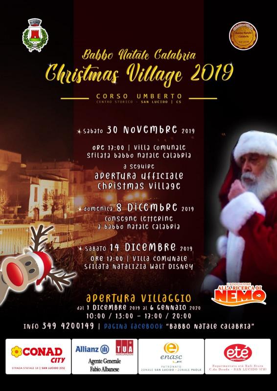 Il 30 novembre a San Lucido (Cosenza) apre il Villaggio di Natale, il Christmas Village con la sfilata di Babbo Natale, gli elfi e tante piccole renne, accompagnati da musicisti e dalle scuole di ballo di San Lucido.