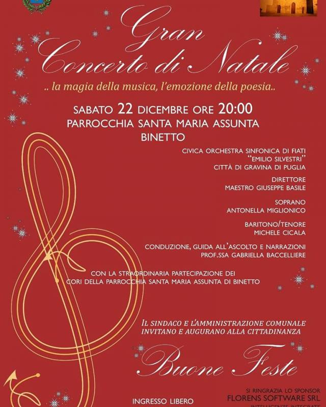 A Binetto in provincia di Bari si svolge nella giornata di Sabato 22 Dicembre 2018 alle ore 20.00 il Gran Concerto di Natale - La Magia della Musica, l'Emozione della Poesia