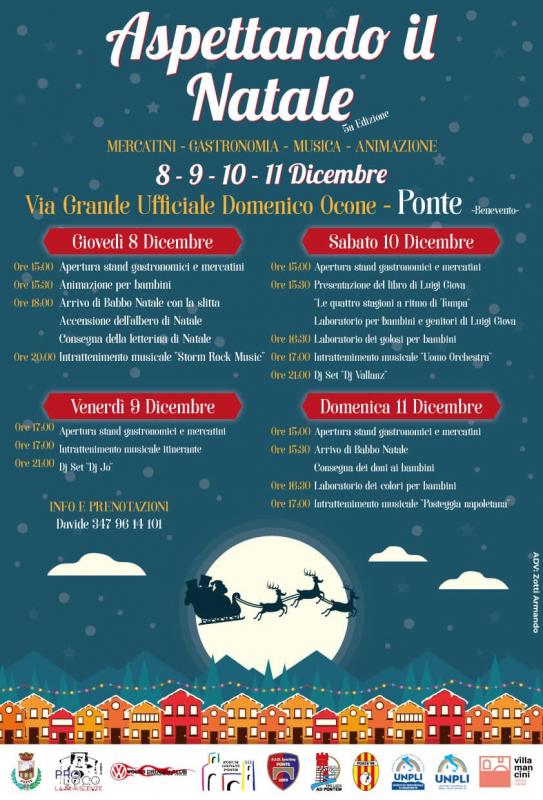 Ufficializzato il programma di ‘Aspettando il Natale’ in programma da giovedì 8 dicembre a domenica 11 dicembre a Ponte, nella centralissima via Grande Ufficiale Domenico Ocone. Un evento giunto alla quinta edizione che ritorna dopo due anni di stop a causa della pandemia ed organizzato dalla Pro Loco ‘La Rinascente’ in collaborazione con il Forum Giovani di Ponte, Asd Ponte ’98, Asd Sporting Ponte, Volks Drugen Club, la Pro Loco ‘Ad Pontem’, Fattoria Sociale ‘Villa Mancini’ e con il patrocinio del Comune di Ponte e dell’Unpli. Saranno quattro giorni di musica, gastronomia, animazione e naturalmente non mancheranno i mercatini.